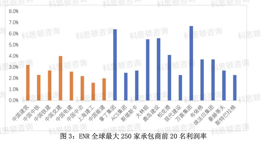 中国的建筑企业虽然体量大,但经营效益还有待提升。对比ENR全球最大250家承包商前20名利润率,发现中国建筑企业的平均利润率为2.8%,而国外建筑企业的平均利润率为4.0%,我们与他们相差1.2个百分点。而且利润率排名靠前的基本上是国外公司。利润率最高的是法国万喜,达到6.7%,其次是拿丁集团,利润率为6.4%,再次是鹿岛建设,利润率为5.6%。中国建筑企业利润率最好的是中交集团为4.0%。