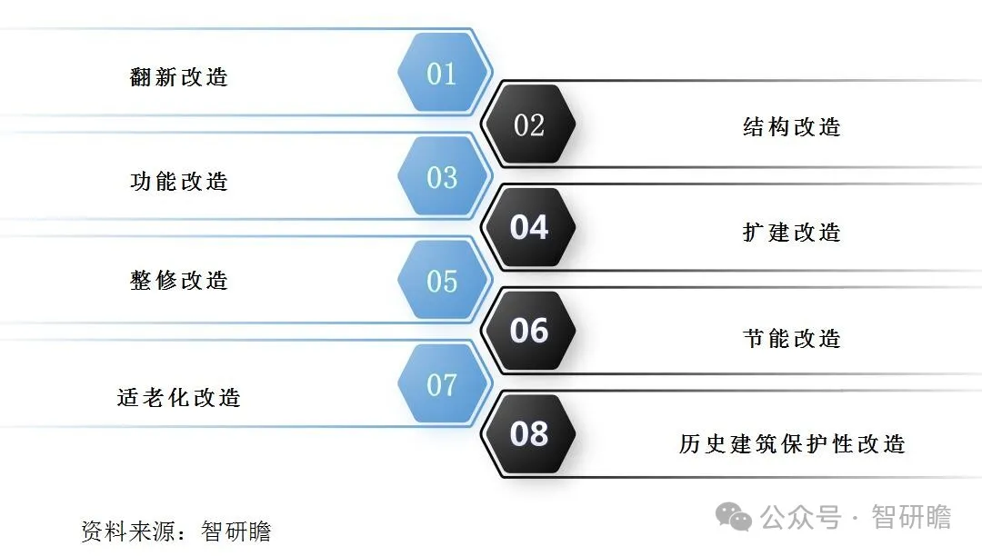 旧房改造是一个涉及广泛且多样化的过程,可以根据不同的目标和需求分为多个类别。其中,翻新改造主要侧重于房屋的美化和风格更新,包括墙面、地板、门窗的更换以及室外景观的改造;结构改造则关注房屋的结构安全,进行必要的加固和增强;功能改造则是指改变房屋的使用功能,以适应新的需求,如住宅转商业或办公场所的调整;扩建改造则是在原有建筑基础上增加新空间,实现空间的拓展;整修改造则是对老旧、破损部分进行修复和维护;节能改造旨在提高房屋的能源效率,减少能源消耗;适老化改造则是针对老年人居住需求进行的特殊改造,以提高居住的安全性和舒适性;而历史建筑保护性改造则侧重于保护和修缮具有历史文化价值的建筑,同时提升其现代使用功能。