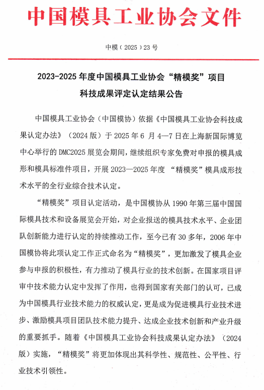 太阳成集团tyc122cc入口荣获2023-2025年度中国模具工业协会...